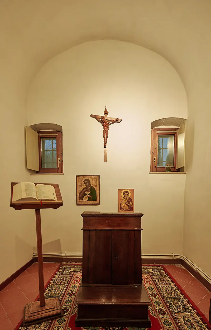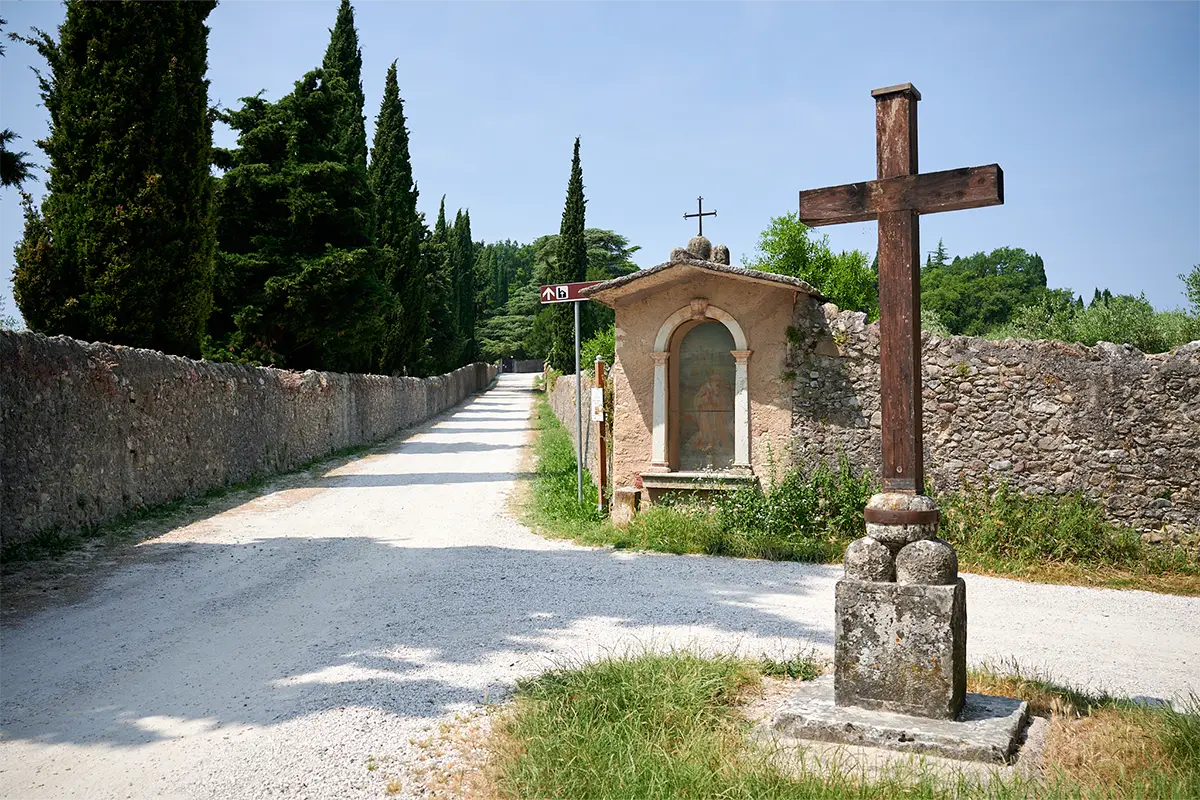 L’eremo di Bardolino sorge sul Monte S. Giorgio, il promontorio che domina il tratto di costa orientale del lago di Garda in territorio di Bardolino, tra Lazise e Garda. È collegato al centro abitato da una strada in parte ancora sterrata e – come solito nella gran parte degli eremi camaldolesi – nell’ultimo tratto in sensibile salita. In conseguenza dell’orientamento che caratterizza il complesso eremitico – disposto secondo la direzione est-sud-est ovest-nord-ovest – a sporgersi dall’alto di un belvedere senza eguali è proprio la zona della clausura, cui fa da discreto diaframma di protezione una corona di secolari cipressi.